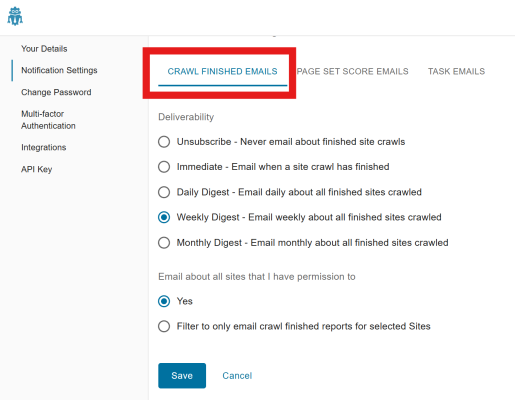 On the "CRAWL FINISHED EMAILS" tab, choose the Deliverability frequency.